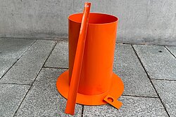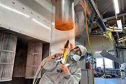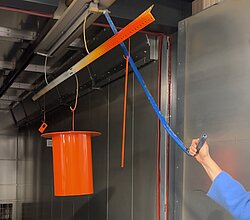 An die Sprühpistole, fertig, los! Die Sprühpistole ist das Werkzeug zum Pulverbeschichten. Das Pulver wird hier hineingefüllt und dabei gleichzeitig elektrisch aufgeladen. Beim Sprühen haftet der Pulverlack dadurch elektrostatisch an den Oberflächen der Werkstücke und bildet eine gleichmäßige Schutzschicht. Unsere Designerobjekte werden in einem kräftigen Orangeton beschichtet. Der farbenfrohe Sprühnebel sieht wirklich toll aus! Das elektrostatische Verfahren macht Pulverlack übrigens zu einer besonders abfallarmen Beschichtung. Was danebengeht, wird aufgefangen und wiederverwendet. Der Materialverlust beträgt so in der Regel weniger als fünf Prozent.