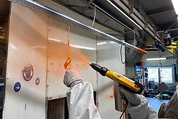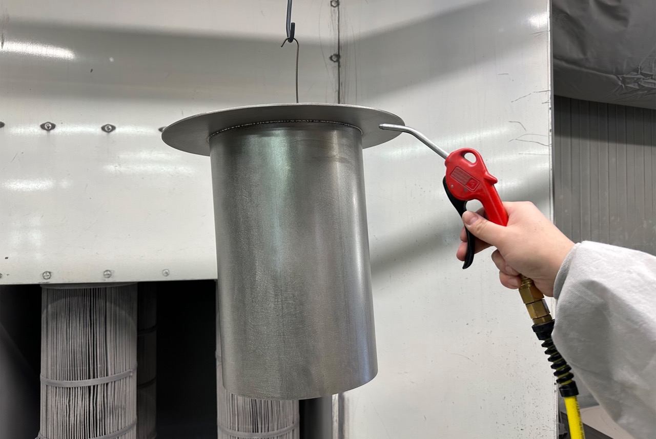 Bevor es ans Pulverbeschichten geht, werden die Gegenstände gründlich gereinigt. Mit Wasser, Druckluft und Reinigungsmitteln lassen sich Verschmutzungen von der Herstellung oder dem Transport entfernen. Dabei wird außerdem eine chemische Reaktion erzeugt, die den Korrosionsschutz verbessert und bewirkt, dass der Pulverlack später gut haften bleibt. Danach müssen die Gegenstände erst einmal trocknen.
