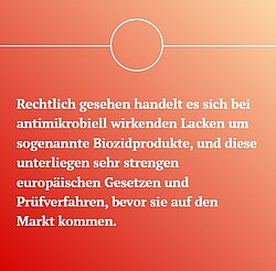 Die Lacke sind so beschaffen, dass sie über sehr lange Zeiträume Wirkstoff freisetzen können. Dazu sind sie mit einem ausreichend großen Wirkstoffreservoir ausgestattet. Selbst aggressive und keimtötende Desinfektionsmittel und häufige Reinigungszyklen mindern die Effektivität und Wirkungsdauer nicht.